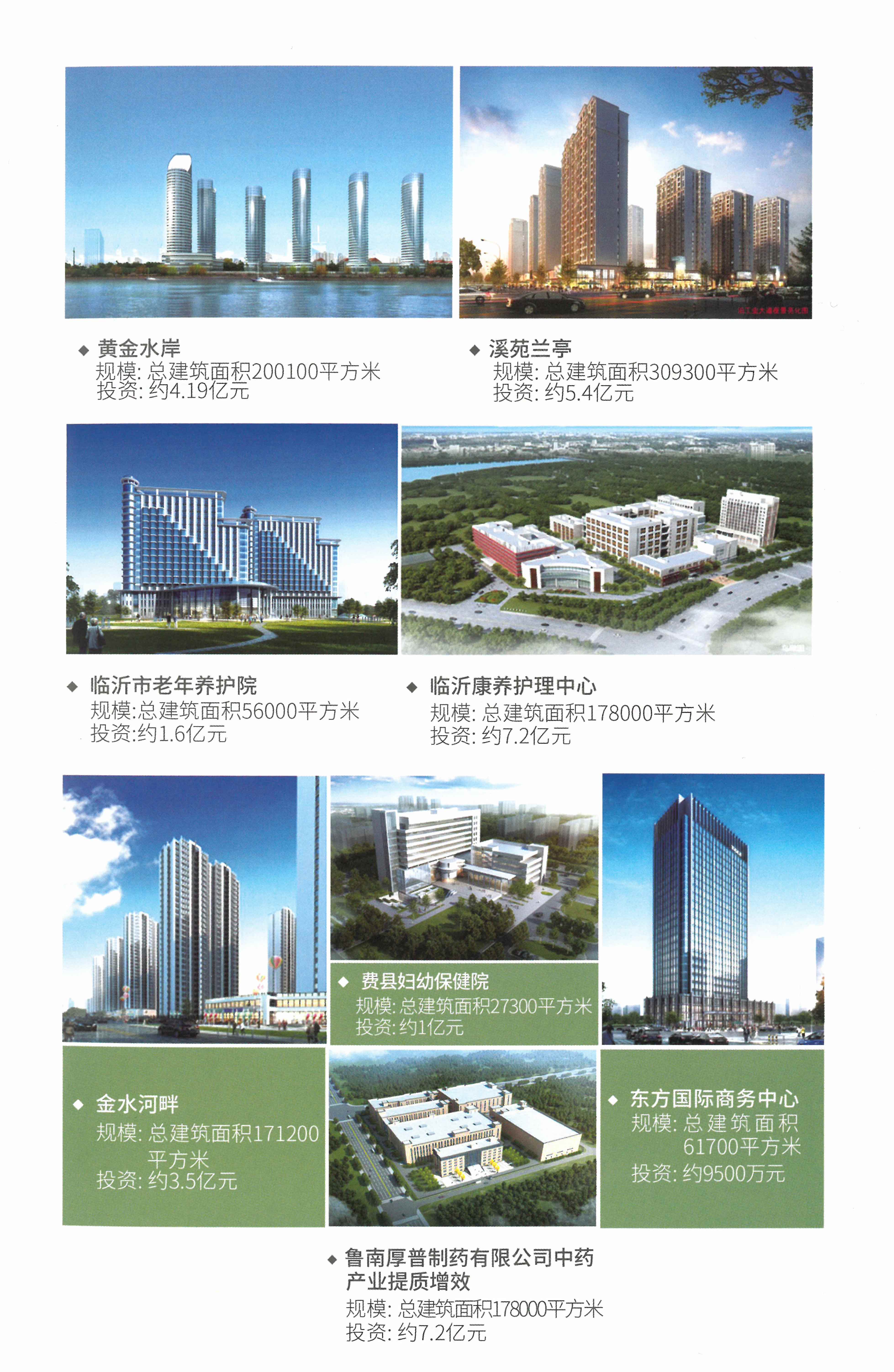 ·黃金水岸 ·東方國(guó)際商務(wù)中心和地下車(chē)庫(kù)工程 ·溪苑蘭亭 ·魯南厚普制藥有限公司中藥產(chǎn)業(yè)提質(zhì)增效 ·臨沂康養(yǎng)護(hù)理中心 ·臨沂市市民活動(dòng)中心 ·臨沂市老年養(yǎng)護(hù)院 ·費(fèi)縣婦幼保健院新院 ·迎賓廣場(chǎng)書(shū)法城 ·蒙陰公共交通樞紐建設(shè) ·金水河畔9#-17#住宅樓及下部商業(yè)、地下車(chē)庫(kù)