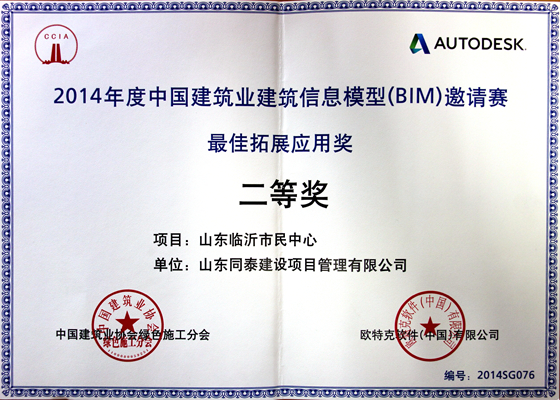 2014年12月,我單位在中國建筑業(yè)協(xié)會與歐特克軟件(中國)有限公司聯(lián)合舉辦的2014中國建筑業(yè)建筑信息模型(BIM)邀請賽上獲得二等獎(jiǎng)。 山東同泰建設(shè)項(xiàng)目管理有限公司 2014年12月23日