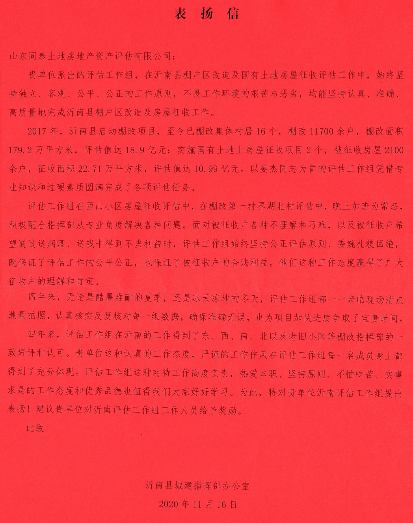 山東同泰土地房地產(chǎn)資產(chǎn)評(píng)估有限公司: 貴單位派出的評(píng)估工作組,在沂南縣棚戶(hù)區(qū)改造及國(guó)有土地房屋征收評(píng)估工作中,始終堅(jiān)持獨(dú)立、客觀、公平、公正的工作原則,不畏工作環(huán)境的艱苦與惡劣,均能堅(jiān)持認(rèn)真、準(zhǔn)確、高質(zhì)量地完成沂南縣棚戶(hù)區(qū)改造及房屋征收工作。2017年,沂南縣啟動(dòng)棚改項(xiàng)目,至今已棚改集體村居16個(gè),棚改11700余戶(hù),棚改面積179.2萬(wàn)平方米,評(píng)估值達(dá)18.9億元;實(shí)施國(guó)有土地上房屋征收項(xiàng)目2個(gè),被征收房屋2100余戶(hù),征收面積22.71萬(wàn)平方米,評(píng)估值達(dá)10.99億元。以姜杰同志為首的評(píng)估工作組憑借專(zhuān)業(yè)知識(shí)和過(guò)硬素質(zhì)圓滿(mǎn)完成了各項(xiàng)評(píng)估任務(wù)。 評(píng)估工作組在西山小區(qū)房屋征收評(píng)估中,在棚改第一村界湖北村評(píng)估中,晚上加班為常態(tài),積極配合指揮部從專(zhuān)業(yè)角度解決各種問(wèn)題。面對(duì)被征收戶(hù)各種不理解和刁難,以及被征收戶(hù)希望通過(guò)送煙酒、送錢(qián)卡得到不當(dāng)利益時(shí),評(píng)估工作組始終堅(jiān)持公正評(píng)估原則、委婉禮貌回絕,既保證了評(píng)估工作的公平公正,也保證了被征收戶(hù)的合法利益,他們這種工作態(tài)度贏得了廣大征收戶(hù)的理解和肯定。 四年來(lái),無(wú)論是酷暑難耐的夏季,還是冰天凍地的冬天,評(píng)估工作組都一一親臨現(xiàn)場(chǎng)清點(diǎn)測(cè)量拍照,認(rèn)真核實(shí)反復(fù)核對(duì)每一組數(shù)據(jù),確保準(zhǔn)確無(wú)誤,也為項(xiàng)目加快進(jìn)度爭(zhēng)取了寶貴時(shí)間。 四年來(lái),評(píng)估工作組在沂南的工作得到了東、西、南、北以及老舊小區(qū)等棚改指揮部的一致好評(píng)和認(rèn)可。貴單位這種認(rèn)真的工作態(tài)度,嚴(yán)謹(jǐn)?shù)墓ぷ髯黠L(fēng)在評(píng)估工作組每一名成員身上都得到了充分體現(xiàn)。評(píng)估工作組這種對(duì)待工作高度負(fù)責(zé),熱愛(ài)本職、堅(jiān)持原則、不怕吃苦、實(shí)事求是的工作態(tài)度和優(yōu)秀品德也值得我們大家好好學(xué)習(xí)。為此,特對(duì)貴單位沂南評(píng)估工作組提出表?yè)P(yáng)!建議貴單位對(duì)沂南評(píng)估工作組工作人員給予獎(jiǎng)勵(lì)。 此致 沂南縣城建指揮部辦公室 2020年11月16日