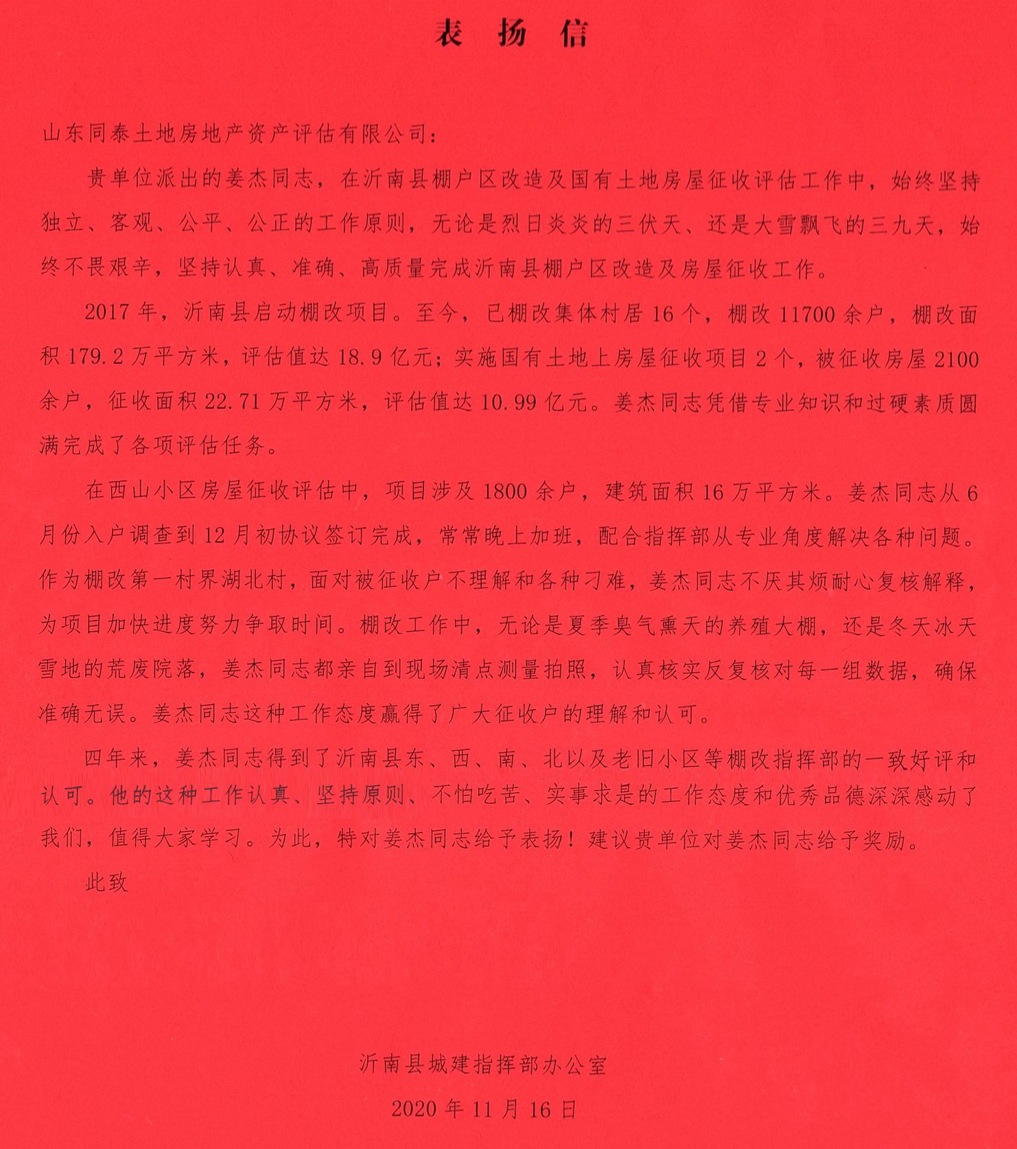 表?yè)P(yáng)信 山東同泰土地房地產(chǎn)資產(chǎn)評(píng)估有限公司: 貴單位派出的姜杰同志,在沂南縣棚戶(hù)區(qū)改造及國(guó)有土地房屋征收評(píng)估工作中,始終堅(jiān)持獨(dú)立、客觀、公平、公正的工作原則,無(wú)論是烈日炎炎的三伏天、還是大雪飄飛的三九天,始終不畏艱辛,堅(jiān)持認(rèn)真、準(zhǔn)確、高質(zhì)量完成沂南縣棚戶(hù)區(qū)改造及房屋征收工作。 2017年,沂南縣啟動(dòng)棚改項(xiàng)目。至今,已棚改集體村居16個(gè),棚改11700余戶(hù),棚改面積179.2萬(wàn)平方米,評(píng)估值達(dá)18.9億元;實(shí)施國(guó)有土地上房屋征收項(xiàng)目2個(gè),被征收房屋2100余戶(hù),征收面積22.71萬(wàn)平方米,評(píng)估值達(dá)10.99億元。姜杰同志憑借專(zhuān)業(yè)知識(shí)和過(guò)硬素質(zhì)圓滿(mǎn)完成了各項(xiàng)評(píng)估任務(wù)。 在西山小區(qū)房屋征收評(píng)估中,項(xiàng)目涉及1800余戶(hù),建筑面積16萬(wàn)平方米。姜杰同志從6月份入戶(hù)調(diào)查到12月初協(xié)議簽訂完成,常常晚上加班,配合指揮部從專(zhuān)業(yè)角度解決各種問(wèn)題。作為棚改第一村界湖北村,面對(duì)被征收戶(hù)不理解和各種刁難,姜杰同志不厭其煩耐心復(fù)核解釋?zhuān)瑸轫?xiàng)目加快進(jìn)度努力爭(zhēng)取時(shí)間。棚改工作中,無(wú)論是夏季臭氣熏天的養(yǎng)殖大棚,還是冬天冰天雪地的荒廢院落,姜杰同志都親自到現(xiàn)場(chǎng)清點(diǎn)測(cè)量拍照,認(rèn)真核實(shí)反復(fù)核對(duì)每一組數(shù)據(jù),確保準(zhǔn)確無(wú)誤。姜杰同志這種工作態(tài)度贏得了廣大征收戶(hù)的理解和認(rèn)可。 四年來(lái),姜杰同志得到了沂南縣東、西、南、北以及老舊小區(qū)等棚改指揮部的一致好評(píng)和認(rèn)可。他的這種工作認(rèn)真、堅(jiān)持原則、不怕吃苦、實(shí)事求是的工作態(tài)度和優(yōu)秀品德深深感動(dòng)了我們,值得大家學(xué)習(xí)。為此,特對(duì)姜杰同志給予表?yè)P(yáng)!建議貴單位對(duì)姜杰同志給予獎(jiǎng)勵(lì)。 此致沂南縣城建指揮部辦公室 2020年11月16日