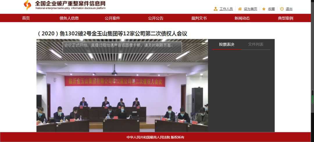 會(huì)議開始后,由臨沂市蘭山區(qū)人民法院合議庭書記員朱靜怡宣讀會(huì)場紀(jì)律,會(huì)議議程第一項(xiàng):合議庭介紹案件進(jìn)展情況;第二項(xiàng):管理人代表尹昌鳳作《管理人履職工作報(bào)告》;第三項(xiàng):審計(jì)機(jī)構(gòu)代表李敏作《審計(jì)工作情況說明》;第四項(xiàng):評估機(jī)構(gòu)代表趙常鑫作《評估工作情況說明》;第五項(xiàng):管理人代表孔鵬作《關(guān)于補(bǔ)充申報(bào)債權(quán)核查的報(bào)告》;第六項(xiàng):管理人代表孔鵬公布《臨沂金玉山集團(tuán)有限公司等十二家公司合并重整計(jì)劃(草案)》并進(jìn)行介紹;第七項(xiàng):管理人代表范昌龍宣讀《債權(quán)人會(huì)議表決規(guī)則》;第八項(xiàng):合議庭宣讀臨時(shí)表決權(quán)決定書;第九項(xiàng):山東省臨沂市沂蒙公證處宣讀第二次債權(quán)人會(huì)議線下表決結(jié)果公證情況;第十項(xiàng):未表決的債權(quán)人進(jìn)行線上表決并由管理人統(tǒng)計(jì)表決結(jié)果;第十一項(xiàng):公布表決結(jié)果,本次會(huì)議上,全部債權(quán)組表決通過重整計(jì)劃草案。歷時(shí)一年,臨沂金玉山集團(tuán)有限公司等十二家重整成功!