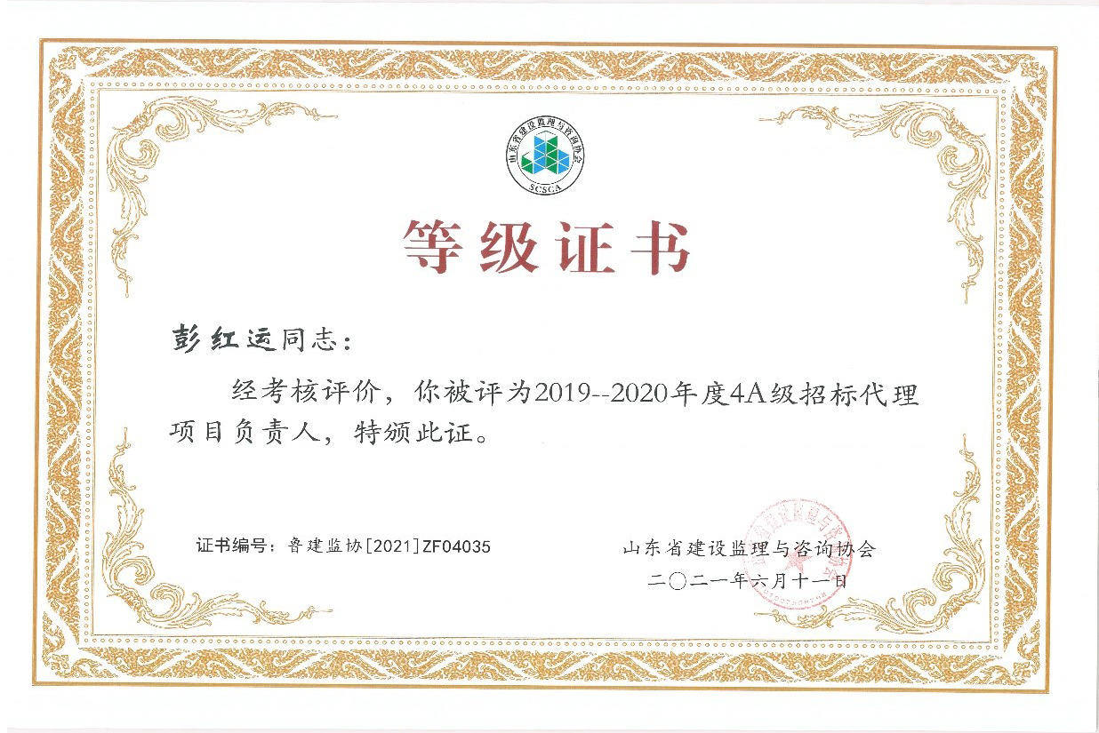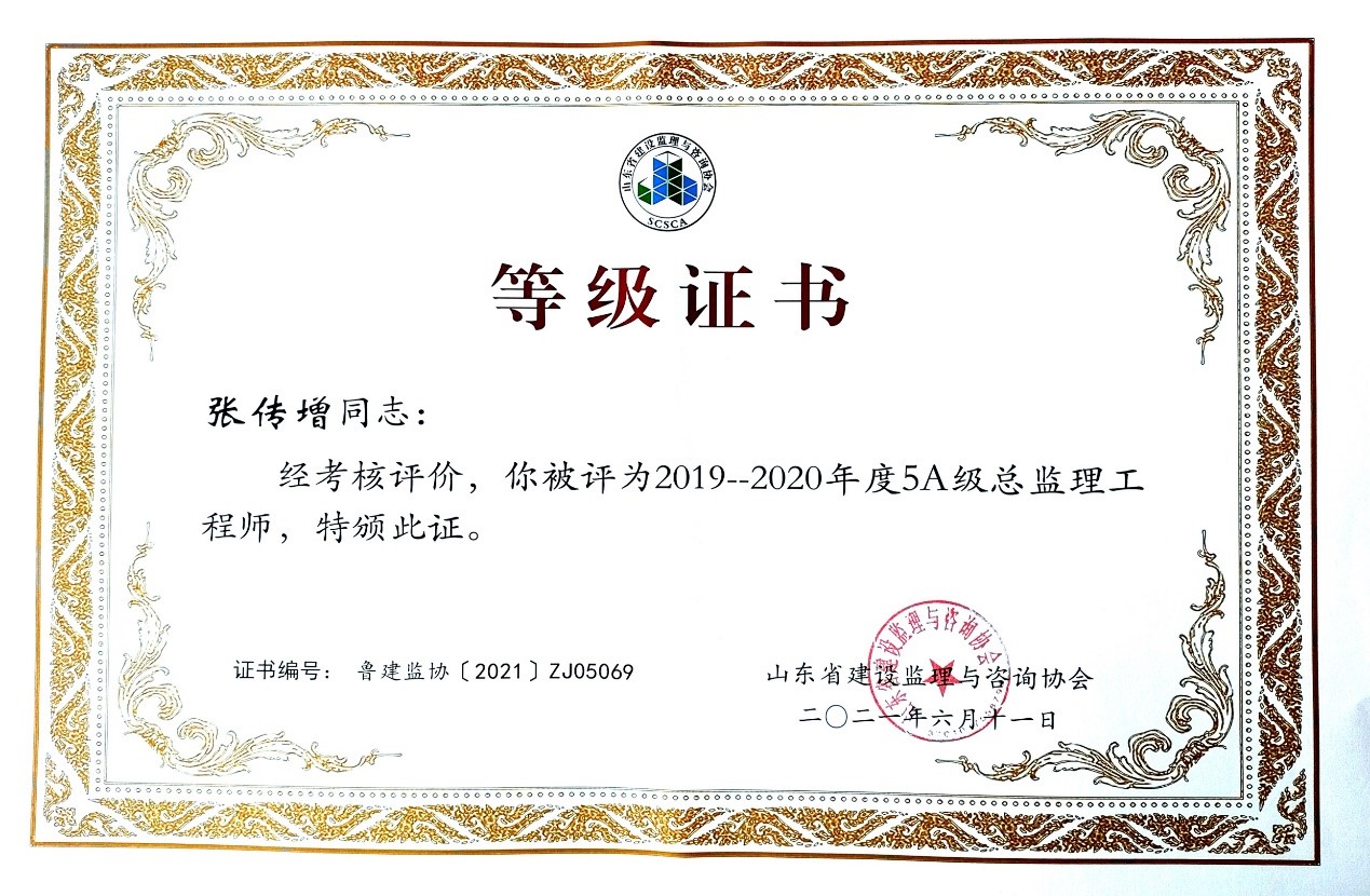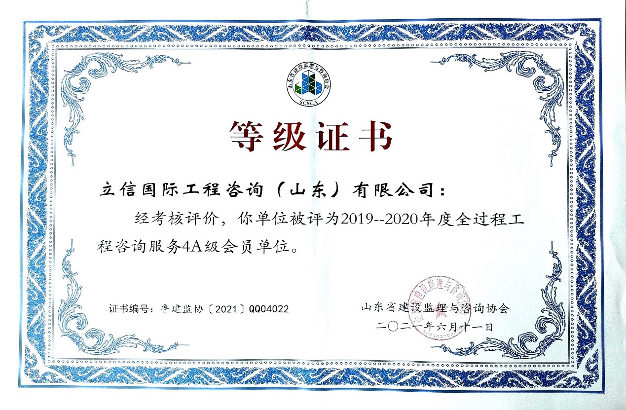 2021年6月,山東省建設(shè)監(jiān)理與咨詢協(xié)會、臨沂市建設(shè)監(jiān)理協(xié)會分別開展了有關(guān)全過程咨詢服務(wù)、監(jiān)理等業(yè)務(wù)的各項綜合考評,立信國際工程咨詢(山東)有限公司在考評中獲得較高信用等級。 在山東省建設(shè)監(jiān)理與咨詢協(xié)會開展的2019-2020年度全過程咨詢服務(wù)業(yè)務(wù)會員單位考核評價工作中,我公司被評選為山東省首批5A級會員監(jiān)理企業(yè)、5A級會員招標代理機構(gòu)、4A級全過程工程咨詢服務(wù)會員單位。 我公司員工多人被山東省建設(shè)監(jiān)理與咨詢協(xié)會評選為2019-2020年度先進,其中,馬海嘯、張傳增被評為5A級總監(jiān)理工程師,高宏、張傳增被評為5A級招標代理項目負責(zé)人,呂建建、彭紅運被評為4A級招標代理項目負責(zé)人。